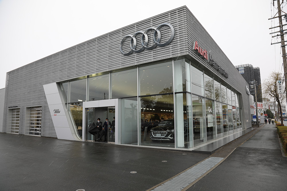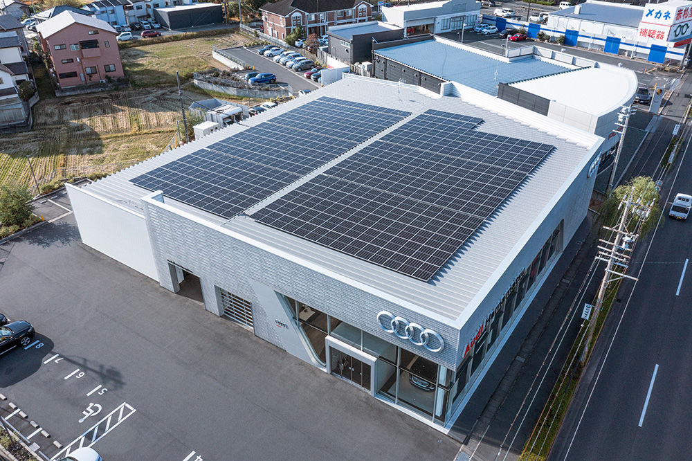 CO2を一切排出しないカーディーラーとして国内初を達成した「アウディ浜松」の外観。