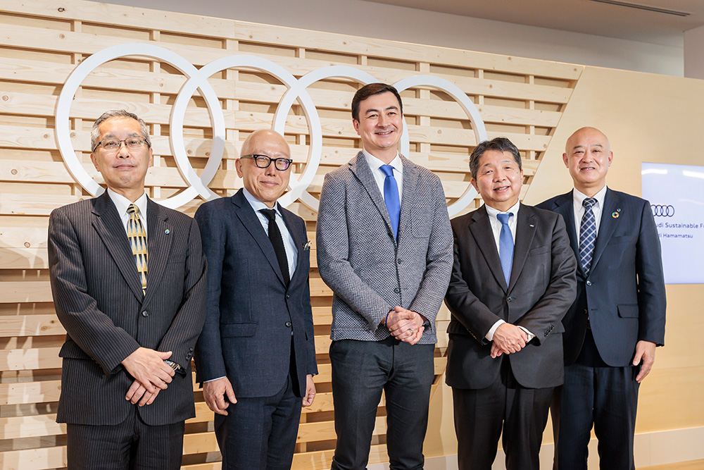 プレゼンテーションに参加された左から浜松市の長田繁喜副市長、サーラコーポレーション神野吾郎代表、アウディジャパンのマティアス・シェーパース・ブランドディレクター、サーラカーズジャパンの坂爪謙治代表、浜松市カーボンニュートラル推進事業本部の村上隆康本部長の各氏。