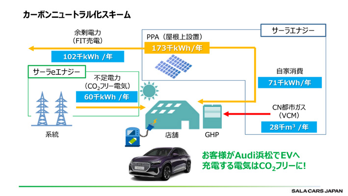 アウディ浜松のカーボンニュートラル化スキーム。店舗屋根のソーラー発電を中心に不足電力は系列のエネルギー会社からCN電力を調達。